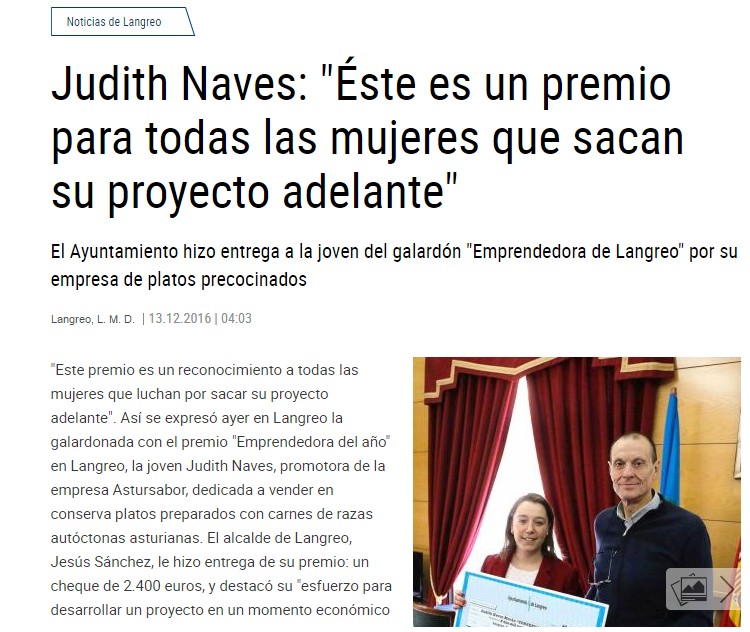La galardonada subrayó el gran apoyo recibido por su familia, a la que dedicó el premio. Una familia emprendedora, que hace medio siglo empezó poniendo en marcha un restaurante. Una «tradición» que ahora ella sigue, pero con otro tipo de negocio. Naves subrayó que «es importante que se den este tipo de premios a las mujeres. Este es un galardón que reconoce el trabajo de todas las emprendedoras». Tras recibir el cheque del premio, Judith Naves anunció que la empresa iba a tener «un detalle con el comedor social de Langreo», ubicado en la Felguera. Hizo entrega de «raciones de ternera asturina IGP, 100% autóctona a todos los usuarios del centro. Es un pequeño detalle con la gente de Langreo que más lo necesita, y más aún teniendo en cuenta las fechas en las que estamos».