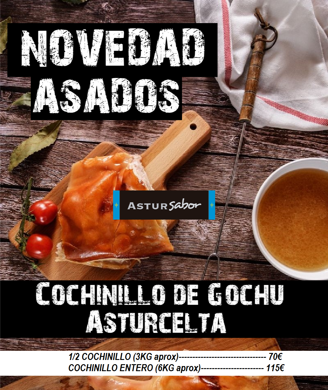 Después de más de 10 años sirviendo a domicilio en estas Fiestas Navideñas, guisos tradicionales con materia prima raza autóctona 100% asturiana, este año 2020 lanzamos una nueva NOVEDAD «COCHINILLO ASTURCELTA ASADO»